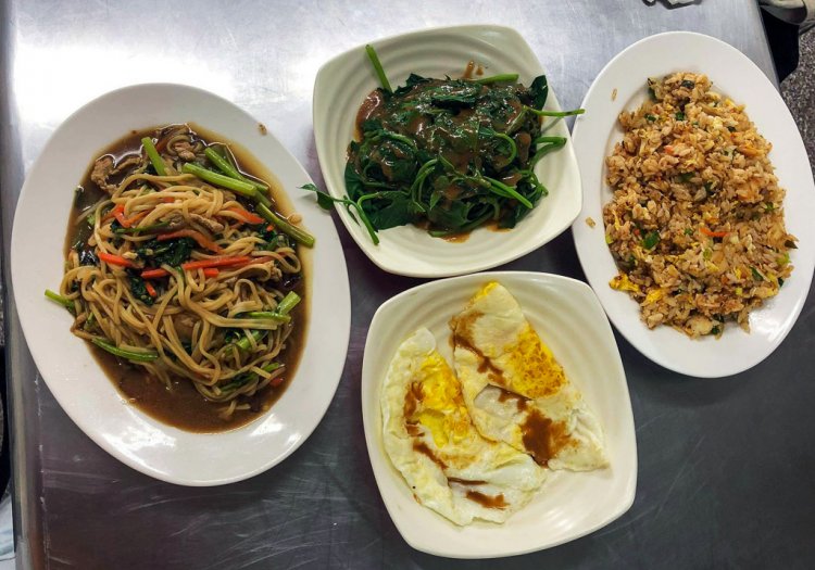 今天我們簡單的點了兩份主餐—泡菜炒飯70元、肉絲炒麵70元、燙青菜30元和兩顆荷包蛋20元,還有一碗魯肉飯30元和鱸魚湯70元,看起來超好吃,忍不住食指大動了!