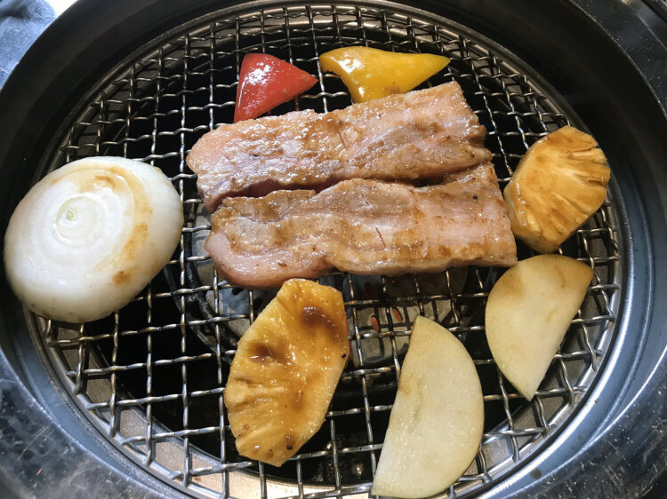 沙拉一共有3種醬可供選擇,分別是:凱薩、胡麻跟柚子醋。給的分量很足,柚子醋的清香非常爽口,大量撒上的新鮮芝麻咬起來香氣十足,令人食慾大開,和之後的燒肉一起吃可以中和油膩感,也很不錯。
