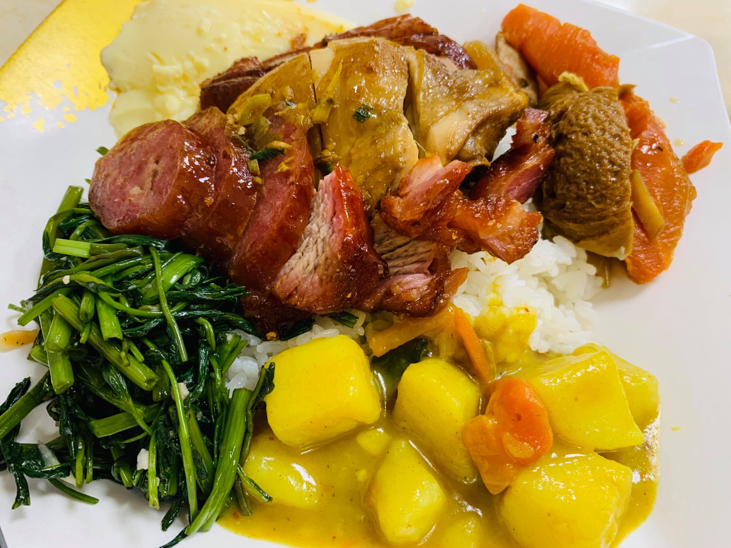 首先是「招牌飯」三樣主菜三次滿足,有香腸-口感紮實愈嚼香氣滿溢、油雞腿-肉質鮮嫩搭配店家獨特醬汁,嫩滑口感絕配、燒鴨肉-肉質紮實,口感鮮嫩有嚼勁帶點鴨肉香氣充滿整個嘴巴,四樣配菜是鮮嫩空心菜、咖哩、蒸蛋、(滷豆輪、紅蘿蔔),我最愛的就是這一味,除了划算,就是非常好吃,飯也煮得很剛好,不會硬。